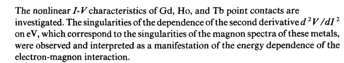 The nonlinearI~Vcharacteristics of Gd, Ho, and Tb point contacts are investigated. The singularities of the dependence of the second derivative d2V/dI2 on eV, which correspond to the singularities of the magnon spectra of these metals, were observed and interpreted as a manifestation of the energy dependence of the electron-magnon interaction.