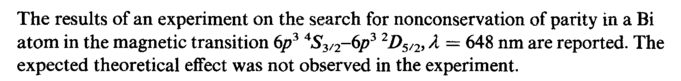 The results of an experiment on the search for nonconservation of parity in a Bi atom in the magnetic transition 6p3 4S3/2-6p3 2D5/2, Л — 648 nm are reported. The expected theoretical effect was not observed in the experiment.