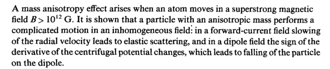 A mass anisotropy effect arises when an atom moves in a superstrong magnetic field B> 1012 G. It is shown that a particle with an anisotropic mass performs a complicated motion in an inhomogeneous field: in a forward-current field slowing of the radial velocity leads to elastic scattering, and in a dipole field the sign of the derivative of the centrifugal potential changes, which leads to falling of the particle on the dipole.