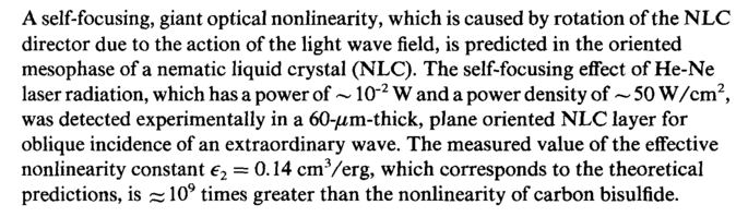 A self-focusing, giant optical nonlinearity, which is caused by rotation of the NLC director due to the action of the light wave field, is predicted in the oriented mesophase of a nematic liquid crystal (NLC). The self-focusing effect of He-Ne laser radiation, which has a power of —10"2 W and a power density of ~ 50 W/cm2, was detected experimentally in a 60-/^m-thick, plane oriented NLC layer for oblique incidence of an extraordinary wave. The measured value of the effective nonlinearity constant e2 = 0.14 cmVerg, which corresponds to the theoretical predictions, is ~ 109 times greater than the nonlinearity of carbon bisulfide.