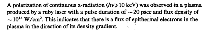 A polarization of continuous x-radiation (A v> 10 keV) was observed in a plasma produced by a ruby laser with a pulse duration of —20 psec and flux density of ~1014 W/cm2. This indicates that there is a flux of epithermal electrons in the plasma in the direction of its density gradient.