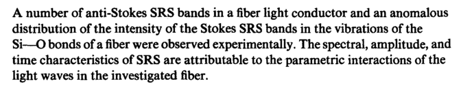 A number of anti-Stokes SRS bands in a fiber light conductor and an anomalous distribution of the intensity of the Stokes SRS bands in the vibrations of the Si—О bonds of a fiber were observed experimentally. The spectral, amplitude, and time characteristics of SRS are attributable to the parametric interactions of the light waves in the investigated fiber.