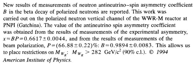 New results of measurements of neutron antineutrino-spin asymmetry coefficient В in the beta decay of polarized neutrons are reported. This work was carried out on the polarized neutron vertical channel of the WWR-M reactor at PNPI (Gatchina). The value of the antineutrino spin asymmetry coefficient was obtained from the results of measurements of the experimental asymmetry, x = BP = 0.6617 + 0.0044, and from the results of measurements of the beam polarization, P = (66.88±0.22)%: 5 = 0.9894±0.0083. This allows us to place restrictions on ΜWr. MWr > 282 GeV/c2 (90% c.l.). © 1994 American Institute of Physics.