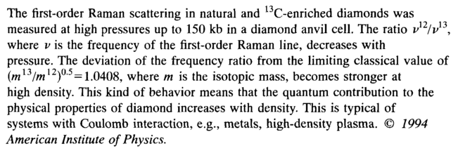 The first-order Raman scattering in natural and C-enriched diamonds was measured at high pressures up to 150 kb in a diamond anvil cell. The ratio vn/v13, where ν is the frequency of the first-order Raman line, decreases with pressure. The deviation of the frequency ratio from the limiting classical value of (m13//n12)0 5 =1.0408, where m is the isotopic mass, becomes stronger at high density. This kind of behavior means that the quantum contribution to the physical properties of diamond increases with density. This is typical of systems with Coulomb interaction, e.g., metals, high-density plasma. © 7994 American Institute of Physics.