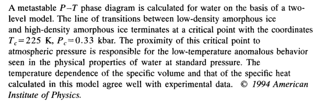 A metastable P-T phase diagram is calculated for water on the basis of a two-level model. The line of transitions between low-density amorphous ice and high-density amorphous ice terminates at a critical point with the coordinates Гс = 225 K, Pc = 0.33 kbar. The proximity of this critical point to atmospheric pressure is responsible for the low-temperature anomalous behavior seen in the physical properties of water at standard pressure. The temperature dependence of the specific volume and that of the specific heat calculated in this model agree well with experimental data. © 7994 American Institute of Physics.