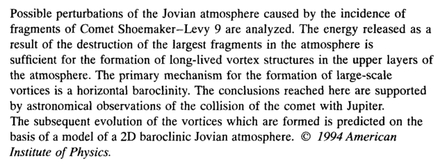Possible perturbations of the Jovian atmosphere caused by the incidence of fragments of Comet Shoemaker-Levy 9 are analyzed. The energy released as a result of the destruction of the largest fragments in the atmosphere is sufficient for the formation of long-lived vortex structures in the upper layers of the atmosphere. The primary mechanism for the formation of large-scale vortices is a horizontal baroclinity. The conclusions reached here are supported by astronomical observations of the collision of the comet with Jupiter. The subsequent evolution of the vortices which are formed is predicted on the basis of a model of a 2D baroclinic Jovian atmosphere. © 1994 American Institute of Physics.