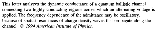This letter analyzes the dynamic conductance of a quantum ballistic channel connecting two highly conducting regions across which an alternating voltage is applied. The frequency dependence of the admittance may be oscillatory, because of spatial resonances of charge-density waves that propagate along the channel. © 1994 American Institute of Physics.