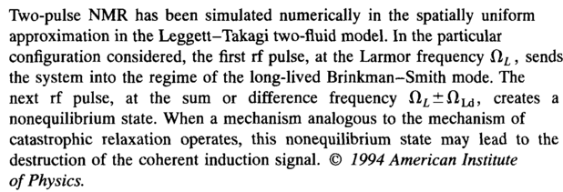Two-pulse NMR has been simulated numerically in the spatially uniform approximation in the Leggett-Takagi two-fluid model. In the particular configuration considered, the first rf pulse, at the Larmor frequency Q,L, sends the system into the regime of the long-lived Brinkman-Smith mode. The next rf pulse, at the sum or difference frequency Ω^ίΐ^, creates a nonequilibrium state. When a mechanism analogous to the mechanism of catastrophic relaxation operates, this nonequilibrium state may lead to the destruction of the coherent induction signal. © 1994 American Institute of Physics.