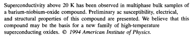 Superconductivity above 20 К has been observed in multiphase bulk samples of a barium-niobium-oxide compound. Preliminary ac susceptibility, electrical, and structural properties of this compound are presented. We believe that this compound may be the basis for a new family of high-temperature superconducting oxides. © 1994 American Institute of Physics.