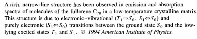 A rich, narrow-line structure has been observed in emission and absorption spectra of molecules of the fullerene C70 in a low-temperature crystalline matrix This structure is due to electronic-vibrational (7\=»SO> ^i°^o) anc* purely electronic (Sx^>Sq) transitions between the ground state S0 and the low-lying excited states Tx and Sx. © 1994 American Institute of Physics.