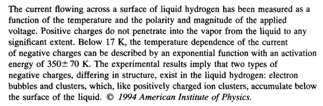 The current flowing across a surface of liquid hydrogen has been measured as a function of the temperature and the polarity and magnitude of the applied voltage. Positive charges do not penetrate into the vapor from the liquid to any significant extent. Below 17 K, the temperature dependence of the current of negative charges can be described by an exponential function with an activation energy of 350± 70 K. The experimental results imply that two types of negative charges, differing in structure, exist in the liquid hydrogen: electron bubbles and clusters, which, like positively charged ion clusters, accumulate below the surface of the liquid. © 1994 American Institute of Physics.