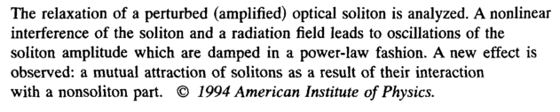 The relaxation of a perturbed (amplified) optical soliton is analyzed. A nonlinear interference of the soliton and a radiation field leads to oscillations of the soliton amplitude which are damped in a power-law fashion. A new effect is observed: a mutual attraction of solitons as a result of their interaction with a nonsoliton part. © 1994 American Institute of Physics.