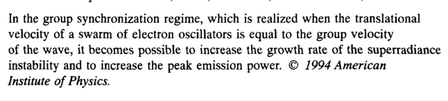 In the group synchronization regime, which is realized when the translational velocity of a swarm of electron oscillators is equal to the group velocity of the wave, it becomes possible to increase the growth rate of the superradiance instability and to increase the peak emission power. © 1994 American Institute of Physics.