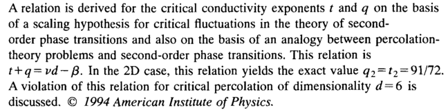 A relation is derived for the critical conductivity exponents t and q on the basis of a scaling hypothesis for critical fluctuations in the theory of second-order phase transitions and also on the basis of an analogy between percolation-theory problems and second-order phase transitions. This relation is t + q = vd~β. In the 2D case, this relation yields the exact value q2 = t2 = 9\ll2. A violation of this relation for critical percolation of dimensionality d=6 is discussed. © 1994 American Institute of Physics.