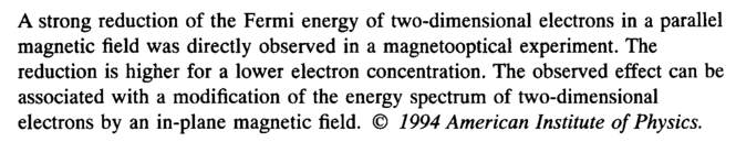 A strong reduction of the Fermi energy of two-dimensional electrons in a parallel magnetic field was directly observed in a magnetooptical experiment. The reduction is higher for a lower electron concentration. The observed effect can be associated with a modification of the energy spectrum of two-dimensional electrons by an in-plane magnetic field. © 1994 American Institute of Physics.