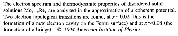 The electron spectrum and thermodynamic properties of disordered solid solutions Μθ! jRe^ are analyzed in the approximation of a coherent potential. Two electron topological transitions are found, at χ — 0.02 (this is the formation of a new electron cavity on the Fermi surface) and at x**>0.08 (the formation of a bridge). © 1994 American Institute of Physics.