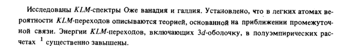 Исследованы KLM-спектры Оже ванадия и галлия. Установлено, что в легких атомах вероятности ΛΓΖ,Λί-переходов описываются теорией, основанной на приближении промежуточной связи. Энергии АХМ-переходов, включающих Зс?-оболочку, в полуэмпирических расчетах 1 существенно завышены.