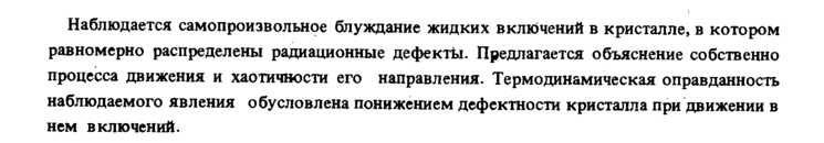 Наблюдается самопроизвольное блуждание жидких включений в кристалле, в котором равномерно распределены радиационные дефекты. Предлагается объяснение собственно процесса движения и хаотичности его направления. Термодинамическая оправданность наблюдаемого явления обусловлена понижением дефектности кристалла при движении в нем включений.