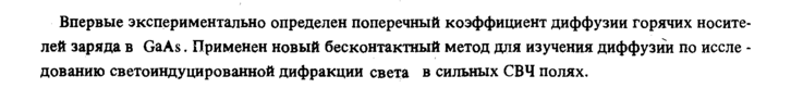 Впервые экспериментально определен поперечный коэффициент диффузии горячих носителей заряда в GaAs. Применен новый бесконтактный метод для изучения диффузии по иссле -дованию светоиндуцированной дифракции света в сильных СВЧ полях.