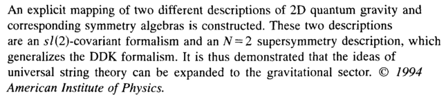 An explicit mapping of two different descriptions of 2D quantum gravity and corresponding symmetry algebras is constructed. These two descriptions are an s/(2)-covariant formalism and an N~2 supersymmetry description, which generalizes the DDK formalism. It is thus demonstrated that the ideas of universal string theory can be expanded to the gravitational sector. © 1994 American Institute of Physics.