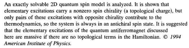 An exactly solvable 2D quantum spin model is analyzed. It is shown that elementary excitations carry a nonzero spin chirality (a topological charge), but only pairs of these excitations with opposite chirality contribute to the thermodynamics, so the system is always in an antichiral spin state. It is suggested that the elementary excitations of the quantum antiferromagnet discussed here are massive if there are no topological terms in the Hamiltonian. © 1994 American Institute of Physics.