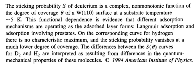 The sticking probability S of deuterium is a complex, nonmonotonic function of the degree of coverage θ of a W(110) surface at a substrate temperature ~5 K. This functional dependence is evidence that different adsorption mechanisms are operating as the adsorbed layer forms: Langmuir adsorption and adsorption involving prestates. On the corresponding curve for hydrogen there is no characteristic maximum, and the sticking probability vanishes at a much lower degree of coverage. The differences between the S( Θ) curves for D2 and H2 are interpreted as resulting from differences in the quantum-mechanical properties of these molecules. © 1994 American Institute of Physics.