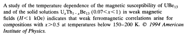 A study of the temperature dependence of the magnetic susceptibility of UBe13 and of the solid solutions OxThi ^xBen (0.07<x<l) in weak magnetic fields (Ж1 kOe) indicates that weak ferromagnetic correlations arise for compositions with x>0.5 at temperatures below 150-200 K. © 1994 American Institute of Physics.