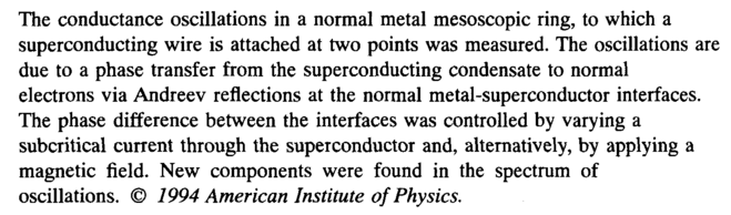 The conductance oscillations in a normal metal mesoscopic ring, to which a superconducting wire is attached at two points was measured. The oscillations are due to a phase transfer from the superconducting condensate to normal electrons via Andreev reflections at the normal metal-superconductor interfaces. The phase difference between the interfaces was controlled by varying a subcritical current through the superconductor and, alternatively, by applying a magnetic field. New components were found in the spectrum of oscillations. © 1994 American Institute of Physics,