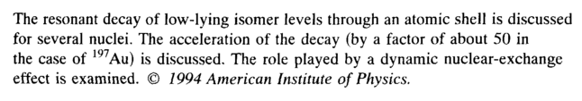The resonant decay of low-lying isomer levels through an atomic shell is discussed for several nuclei. The acceleration of the decay (by a factor of about 50 in the case of 197Au) is discussed. The role played by a dynamic nuclear-exchange effect is examined. © 1994 American Institute of Physics.