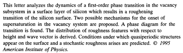 This letter analyzes the dynamics of a first-order phase transition in the vacancy subsystem in a surface layer of silicon which results in a roughening transition of the silicon surface. Two possible mechanisms for the onset of supersaturation in the vacancy system are proposed. A phase diagram for the transition is found. The distribution of roughness features with respect to height and wave vector is derived. Conditions under which quasiperiodic structures appear on the surface and a stochastic roughness arises are predicted. © 1995 American Institute of Physics.