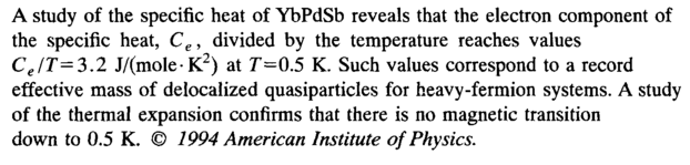 A study of the specific heat of YbPdSb reveals that the electron component of the specific heat, Ce, divided by the temperature reaches values СeΠ'=3.2 J/(mole-K2) at T—0.5 K. Such values correspond to a record effective mass of delocalized quasiparticles for heavy-fermion systems. A study of the thermal expansion confirms that there is no magnetic transition down to 0.5 K. © 1994 American Institute of Physics.