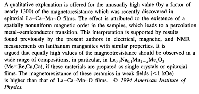 A qualitative explanation is offered for the unusually high value (by a factor of nearly 1300) of the magnetoresistance which was recently discovered in epitaxial La-Ca-Mn-0 films. The effect is attributed to the existence of a spatially nonuniform magnetic order in the samples, which leads to a percolation metal-semiconductor transition. This interpretation is supported by results found previously by the present authors in electrical, magnetic, and NMR measurements on lanthanum manganites with similar properties. It is argued that equally high values of the magneotresistance should be observed in a wide range of compositions, in particular, in Lag 9Nao jMnj _^Mex03 (Me=Re,Cu,Co), if these materials are prepared as single crystals or epitaxial films. The magnetoresistance of these ceramics in weak fields (<1 kOe) is higher than that of La-Ca-Mn-0 films. © 1994 American Institute of Physics.