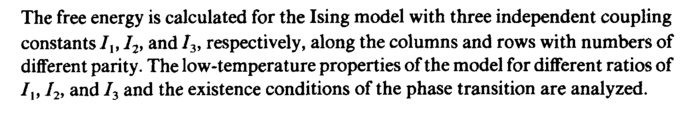 The free energy is calculated for the Ising model with three independent coupling constants /„ I2, and 73, respectively, along the columns and rows with numbers of different parity. The low-temperature properties of the model for different ratios of /„ I2, and I3 and the existence conditions of the phase transition are analyzed.