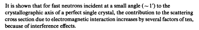 It is shown that for fast neutrons incident at a small angle (~ Γ) to the crystallographic axis of a perfect single crystal, the contribution to the scattering cross section due to electromagnetic interaction increases by several factors of ten, because of interference effects.