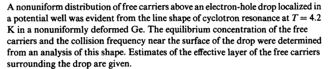 A nonuniform distribution of free carriers above an electron-hole drop localized in a potential well was evident from the line shape of cyclotron resonance at Τ = 4,2 К in a nonuniformly deformed Ge. The equilibrium concentration of the free carriers and the collision frequency near the surface of the drop were determined from an analysis of this shape. Estimates of the effective layer of the free carriers surrounding the drop are given.
