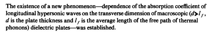 The existence of a new phenomenon—dependence of the absorption coefficient of longitudinal hypersonic waves on the transverse dimension of macroscopic (d>lf, d is the plate thickness and lf is the average length of the free path of thermal phonons) dielectric plates—was established.