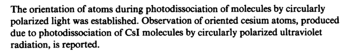 The orientation of atoms during photodissociation of molecules by circularly polarized light was established. Observation of oriented cesium atoms, produced due to photodissociation of Csl molecules by circularly polarized ultraviolet radiation, is reported.