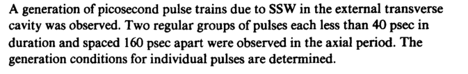 A generation of picosecond pulse trains due to SSW in the external transverse cavity was observed. Two regular groups of pulses each less than 40 psec in duration and spaced 160 psec apart were observed in the axial period. The generation conditions for individual pulses are determined.