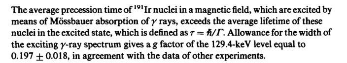 The average precession time of 91Ir nuclei in a magnetic field, which are excited by means of Mossbauer absorption of γ rays, exceeds the average lifetime of these nuclei in the excited state, which is defined as r = ή/Γ. Allowance for the width of the exciting y-ray spectrum gives a g factor of the 129.4-keV level equal to 0.197 ± 0.018, in agreement with the data of other experiments.