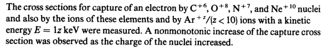 The cross sections for capture of an electron by C+6,0+8, N+7, and Ne+10 nuclei and also by the ions of these elements and by Ar + V(z < 10) ions with a kinetic energy Ε ~ \z keV were measured. A nonmonotonic increase of the capture cross section was observed as the charge of the nuclei increased.