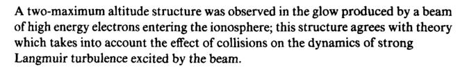 A two-maximum altitude structure was observed in the glow produced by a beam of high energy electrons entering the ionosphere; this structure agrees with theory which takes into account the effect of collisions on the dynamics of strong Langmuir turbulence excited by the beam.