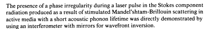The presence of a phase irregularity during a laser pulse in the Stokes component radiation produced as a result of stimulated MandePshtam-Brillouin scattering in active media with a short acoustic phonon lifetime was directly demonstrated by using an interferometer with mirrors for wavefront inversion.