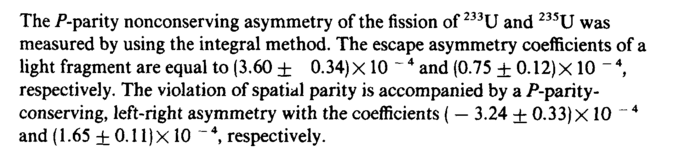 The P-parity nonconserving asymmetry of the fission of 233U and 235U was measured by using the integral method. The escape asymmetry coefficients of a light fragment are equal to (3,60 ± 0.34) X 10 ~ 4 and (0.75 ± 0.12)X 10 " 4, respectively. The violation of spatial parity is accompanied by a P-parity-conserving, left-right asymmetry with the coefficients ( — 3.24 ± 0.33) X 10 "4 and (1.65 + 0.11)Xl0 "4, respectively.