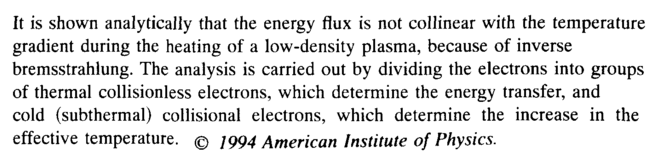 It is shown analytically that the energy flux is not collinear with the temperature gradient during the heating of a low-density plasma, because of inverse bremsstrahlung. The analysis is carried out by dividing the electrons into groups of thermal collisionless electrons, which determine the energy transfer, and cold (subthermal) collisional electrons, which determine the increase in the effective temperature. © /994 American Institute of Physics.
