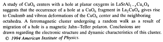 A study of Cu06 centers with a hole at planar oxygens in LaSrAlj .^Cu^C^ suggests that the occurrence of a hole at a Cu06 fragment in La2Cu04 gives rise to Coulomb and vibron deformations of the Cu06 center and the neighboring octahedra. A ferromagnetic cluster undergoing a random walk as a result of migration of a hole is a magnetic Jahn-Teller polaron. Conclusions are drawn regarding the electronic structure and dynamic characteristics of this cluster. © 1994 American Institute of Physics.