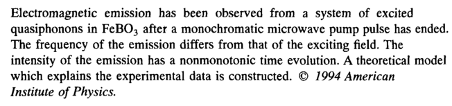 Electromagnetic emission has been observed from a system of excited quasiphonons in FeB03 after a monochromatic microwave pump pulse has ended. The frequency of the emission differs from that of the exciting field. The intensity of the emission has a nonmonotonic time evolution. A theoretical model which explains the experimental data is constructed. © 1994 American Institute of Physics.