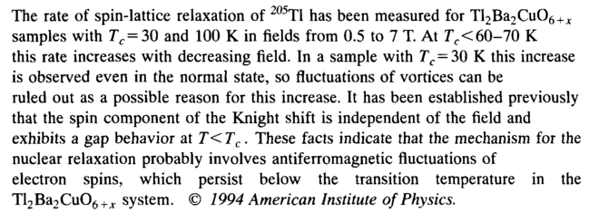The rate of spin-lattice relaxation of Tl has been measured for TI2Ba2Cu06+x samples with Tc=30 and 100 К in fields from 0.5 to 7 T. At Tc<60-70 К this rate increases with decreasing field. In a sample with Гс = 30 К this increase is observed even in the normal state, so fluctuations of vortices can be ruled out as a possible reason for this increase. It has been established previously that the spin component of the Knight shift is independent of the field and exhibits a gap behavior at T<TC. These facts indicate that the mechanism for the nuclear relaxation probably involves antiferromagnetic fluctuations of electron spins, which persist below the transition temperature in the Tl2Ba2Cu06+jr system. © 1994 American Institute of Physics.