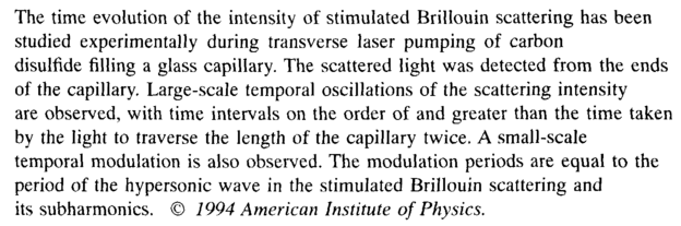 The time evolution of the intensity of stimulated Brillouin scattering has been studied experimentally during transverse laser pumping of carbon disulfide filling a glass capillary. The scattered light was detected from the ends of the capillary. Large-scale temporal oscillations of the scattering intensity are observed, with time intervals on the order of and greater than the time taken by the light to traverse the length of the capillary twice. A small-scale temporal modulation is also observed. The modulation periods are equal to the period of the hypersonic wave in the stimulated Brillouin scattering and its subharmonics. © 1994 American Institute of Physics.