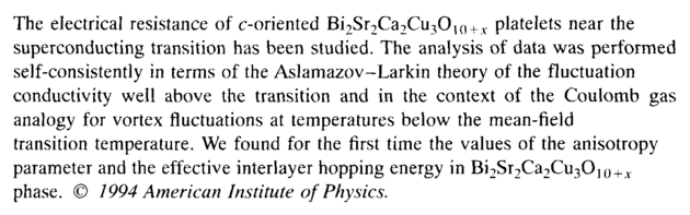 The electrical resistance of c-oriented Bi2Sr2Ca2Cu3O,0 + v platelets near the superconducting transition has been studied. The analysis of data was performed self-consistently in terms of the Aslamazov-Larkin theory of the fluctuation conductivity well above the transition and in the context of the Coulomb gas analogy for vortex fluctuations at temperatures below the mean-field transition temperature. We found for the first time the values of the anisotropy parameter and the effective interlayer hopping energy in Bi2Sr2Ca2Cu30]o+x phase. © 1994 American Institute of Physics.