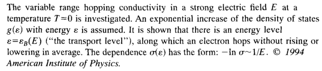 The variable range hopping conductivity in a strong electric field £ at a temperature T=0 is investigated. An exponential increase of the density of states g(e) with energy ε is assumed. It is shown that there is an energy level ε=εΒ(Ε) ("the transport level"), along which an electron hops without rising or lowering in average. The dependence σ{ε) has the form: —In σ~\/Ε. © 1994 American Institute of Physics.